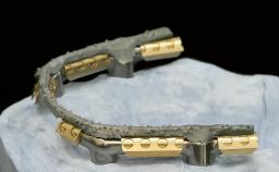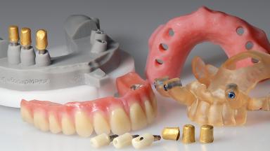 A 74-year-old male patient presented to the Department of Oral Medicine at the Goethe University in Frankfurt, Germany. The patient had been edentulous for 15 months and had been treated with a complete denture by students in the undergraduate program. During a recall appointment, the patient complained of poor retention of his maxillary complete denture. The prosthetic site consisted of a rigid and thick maxillary ridge with an undercut in the left posterior region. The prosthesis covered the entire palate and was dislodged by biting on solid foods such as apples. The patient did not have high esthetic expectations, but he did want improved chewing comfort and "fixed teeth".