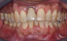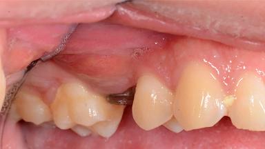 A healthy 20-year-old patient presented with missing upper right second premolar, and implant placement was performed uneventfully. Unfortunately, he returned with a postoperative infection 3 weeks later. This was successfully managed with systemic antibiotics, and the treatment approach was changed to a 2-stage protocol. Contour augmentation was performed during Stage 2 implant surgery to restore buccal bone contour, and the implant-supported single crown was delivered without compromising the end result.