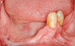 A 93-year-old female patient presented in September 2010 with an enlarged swelling on the lingual side of her lower incisors. At the time, she was essentially healthy, except for reduced vision due to bilateral age-related macular degeneration. She had been a heavy smoker (about 30 cigarettes a day) for the past 20 years after becoming a widow. The patient lived at home by herself, with full-time domestic support. An extraoral examination revealed nothing adverse. Intraoral plaque control was anything but ideal, and a soft-tissue tumescence was visible around the lingual aspect of 41–42. Because the nature of the lesion was not clear, a biopsy was carried out that revealed the inflammatory nature of the lesion. The panoramic radiograph showed six irregularly distributed mandibular implants supporting a full-arch prosthesis, with various degrees of interproximal peri-implant resorption. The periapical radiograph revealed interproximal bone resorption mesially and distally to implant 41.