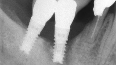 A 82-year-old female patient was referred to the Department of Oral Surgery and Stomatology at the University of Bern, Switzerland, for further diagnosis and treatment of growing discomfort in the right mandible (implant 45) and left maxilla (implant 23). The patient had had implants of various types inserted in the mandible and maxilla over the course of the previous three decades (in the 1980s and 1990s). The patient had received removable partial dentures on implants in the maxilla and on natural teeth in the mandible. The implants in the posterior right mandible had been restored with two splinted single crowns. The lower partial denture was not well tolerated by the patient and therefore had not been worn for over ten years. After insertion of the implants, there had been no complications for many years, but implants 45 and 46 as well as 23 had begun to exhibit signs of peri-implantitis with limited bone loss several years previously. The infection had been treated by the private practitioner, and bone loss around the three implants had not progressed until about half a year previously.