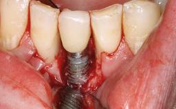 A 65-year-old female patient was referred to the periodontist for assessment and management of implant site 12. Implant 12 had been placed ten years previously and restored with a cemented single crown. The patient was a non-smoker in good general and periodontal health. On examination there were 7 mm probing depths at implant 12 with suppuration and bleeding on probing. The patient was aware of the presence of pus but had no discomfort. A periapical radiograph showed marginal bone loss to approximately the third thread of the implant. Previous radiographs obtained from the referring clinician indicated that there had been progressive bone loss since the implant was restored. A diagnosis of periimplantitis was made.