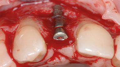 A 35-year old female patient was referred to the Department of Oral Surgery and Stomatology at the University of Bern, Switzerland, for examination of an implant site that had exhibited clinical signs of slightly delayed wound healing. In addition, the referring clinician found no evidence for a facial bone wall when she raised a flap to gain access to the implant for abutment connection. Four months earlier, she had inserted a bone-level implant in a single-tooth gap, where the lateral incisor had been extracted due to a chronic periapical lesion on the mesial aspect of the root. Implant placement was combined with simultaneous bone augmentation using deproteinized bovine bone mineral (DBBM, Bio-Oss®; Geistlich, Wolhusen, Switzerland) and a collagen membrane (Bio- Gide®; Geistlich), followed by primary wound closure. The patient also provided the postsurgical radiograph that displayed the implant with a 3.5-mm healing cap.