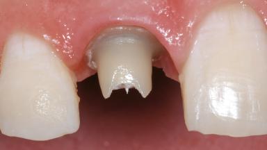 A healthy 32-year-old male patient presented at the clinic for a consultation on treatment options to replace his failing central incisors and retained deciduous canine. This case review addresses the treatment of the central incisors. At full smile, the patient exhibited a medium lip line with tapered clinical crowns and a thin-gingiva biotype. A retracted view of the central incisors showed a discrepancy in the gingival margin positions of teeth 11 and 21. A radiographic examination revealed that teeth 11 and 21 were subject to external and internal resorption and that an impacted canine was present. A clinical and radiographic examination showed good circumferential bone support of the anterior teeth. A detailed examination was performed to determine the esthetic risk profile for this patient.
