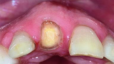 A 49-year-old female patient was referred for implant therapy to replace the upper right central incisor (tooth 11). The tooth had been assessed by an endodontist who diagnosed a vertical fracture of the root. The tooth had a hopeless prognosis and needed to be extracted. The patient was healthy and was not taking any medications. She was allergic to penicillin. The patient had high esthetic demands but her expectations were realistic. The extraoral examination revealed no facial asymmetries. The right temporomandibular joint demonstrated an opening click but was otherwise asymptomatic. The lip line was high with a significant gingival display.