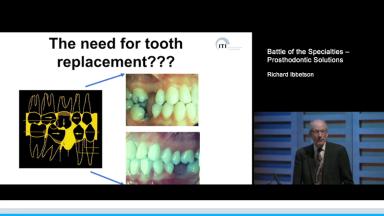 This presentation compares implant-supported and tooth-supported fixed dental prostheses (FDPs) for missing teeth. In an entertaining manner, Richard Ibbetson argues that the way forward in fixed tooth replacement is through the use of dental implants, in spite of the enormous technical demands on the clinician. He uses research to juxtapose these two treatment modalities in terms of technical and mechanical complications (higher for implant-supported FDPs) and biological and terminal complications (higher for tooth-supported FDPs). A unifying theme of this lecture is the importance of communication with the patient and patient choice in tooth replacement.
