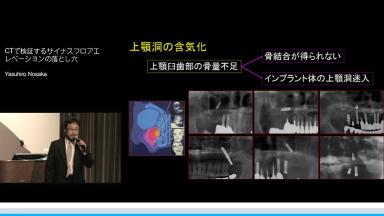 サイナスフロアエレベーションについて、成書では言及されてこなかった臨床的な現象をCT画像、病理検査結果を基に検証した講演である。実際の臨床手技の中で特に関心の高い上顎洞内の粘液嚢胞について、隔壁について、洞底粘膜穿孔について、術後感染について、演者の考え方や手技が述べられていて非常に実践的内容である。またサイナスフロアエレベーションの長期経過についても多くの臨床例をCT画像で検証した結果から様々な現象について言及している。