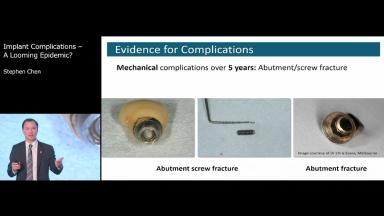 In this lecture, Dr. Chen presents classification of dental implants complications and discusses the prevalence of these complications and which factors contribute to their occurrence. Perioperative complications comprise bleeding, infection, nerve injury and failure of osseointegration. These complications are serious but relatively rare; therefore, the remainder of the lecture focuses on post-integration or post-loading complications, which might be of biological, hardware or esthetic nature. These complications affect the long-term success of dental implant treatment. Dr. Chen also discusses the impact of implant complications, both from the clinician’s and patients’ perspective.