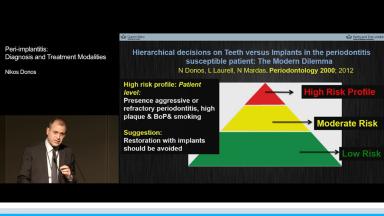 This presentation begins with a discussion of strategic extraction: whether teeth should be extracted as a first choice or kept as long as they function. An overview of estimated numbers of placed and failed implants internationally is given, and differences between the treatment strategies of prosthodontists, periodontists, general practitioners, and surgeons are presented. The definition, prevalence, and risk factors of peri-implantitis and related problems are emphasized. Assessment and diagnosis of peri-implantitis, the importance of radiographic assessment, and evaluation of progressive bone loss are described. The main part of the presentation concentrates on viable treatment options such as antibacterial therapy and ultrasonic debridement, highlighting that prevention is the best treatment.