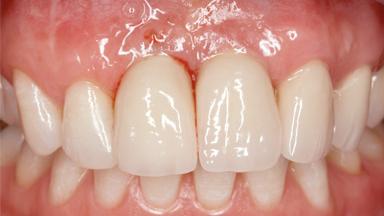 A 45-year-old woman was referred for management of an infection associated with two implant-supported crowns replacing the maxillary central incisors. Two tissue-level implants had been placed and restored with cemented single metal-ceramic crowns in those sites 4 years previously. The patient presented with a draining sinus (i.e. a pathological duct from an abscess cavity to a surface) 3 mm from the midfacial peri-implant mucosal margin of the maxillary right implant crown. She was in good general health, did not smoke, showed a good oral hygiene status, and had no history of periodontal disease. The implants were well positioned. While the patient was very satisfied with the appearance of her crowns, she had noted that the peri-implant soft tissue had receded since their insertion and was concerned about the possibility of further recession.