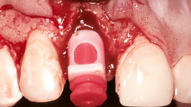 A healthy 26-year-old woman was referred for evaluation and treatment of her failing maxillary right central incisor (tooth 11). She reportedly traumatized the tooth at about age 9 and subsequently had repeated conventional and surgical endodontic procedures and fixed restorations. Despite these procedures, she had recurrent fistulas in the apical mucosa and a mid-facial pocket of 7 mm with suppuration. All other sites on the tooth probed 3 mm without inflammation. She presented with a medium biotype with triangularlyshaped teeth and a moderately high smile line, showing all of her papillas and a few millimeters of marginal gingiva in a full smile.Ceramic veneers were present on teeth 12, 21, and 22, and they were known to be somewhat bulky, eventually requiring replacement. She had a strong desire to avoid additional tooth preparation and would not consider a fixed dental prosthesis to replace tooth 11.