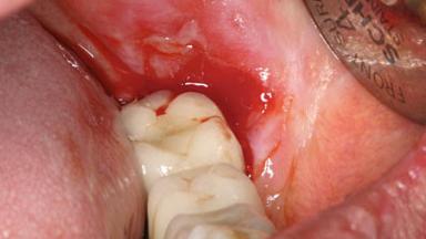 This case describes the ongoing management of a 64-year-old healthy, non-smoking female patient with erosive oral lichen planus (OLP) affecting the gingivae and the buccal and lingual mucosa. The peri-implant mucosa was also affected subsequent to implant placement. The patient had osseointegrated implants (four in the maxilla, four in the mandible) placed following extraction of hopeless teeth and a healing period. The patient had a history of OLP prior to implant placement and had been referred to an oral-medicine specialist for definitive diagnosis and treatment. She exhibited generalized oral mucosal involvement. Following a clinical assessment, biopsy, and blood tests, she was treated with topical corticosteroids. Systemic prednisolone was reserved for severe flare-ups. Amphotericin lozenges were used in combination with corticosteroid treatment to prevent the development of oral candidiasis.