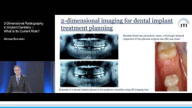 In implant dentistry, diagnostic imaging serves two main purposes: to establish a diagnosis and to aid in surgical treatment planning. This lecture provides a brief overview of the role of diagnostic radiography as well as the available options for two-dimensional imaging. Next, the use of 2D imaging for implant treatment planning is covered in detail using a case example. Finally, the lecturer shows how 2D imaging is the appropriate technique to confirm the position of an implant in relation to anatomical boundaries as well as for follow-up in most clinical situations.