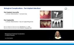 In this lecture risk factors for implant failure are reviewed with an emphasis on the importance of recognizing these factors prior to treatment by means of risk assessment tools such as the SAC. With aid of numerous clinical cases the speaker explains his interdisciplinary approach to managing implant complications. Clinical cases include an esthetic failure due to a compromised 3D implant position; lack of keratinized gingiva requiring a free gingival graft; and the treatment of titanium-tattooed gingiva. The lecture concludes with discussion of peri-implantitis caused by cement excess. The lecturer demonstrates the advantages and indications for the use of the Perioscope device for the examination and visualization of cement excess. Recommendations for a post-cementation protocol for routine use are shared.